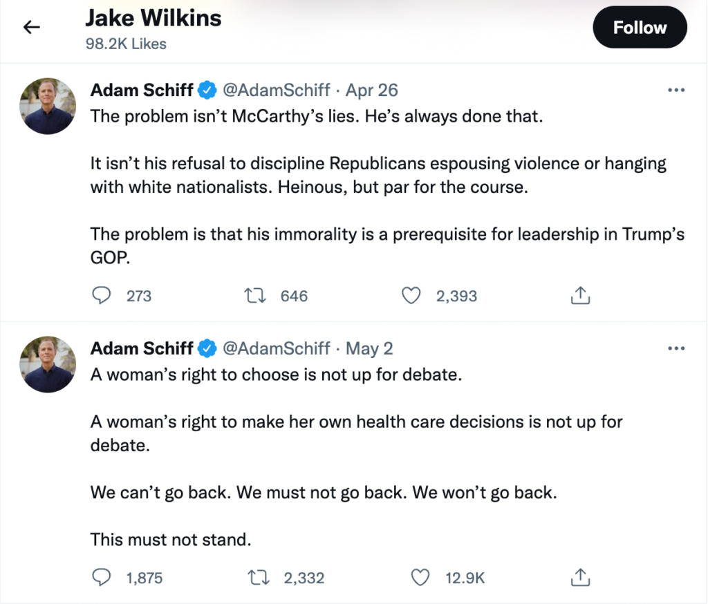 “A woman’s right to choose is not up for debate,” Democratic Rep. Adam Schiff said in one of the tweets Wilkins liked, referring to the Supreme Court’s impending reversal of Roe v. Wade. “This must not stand.”