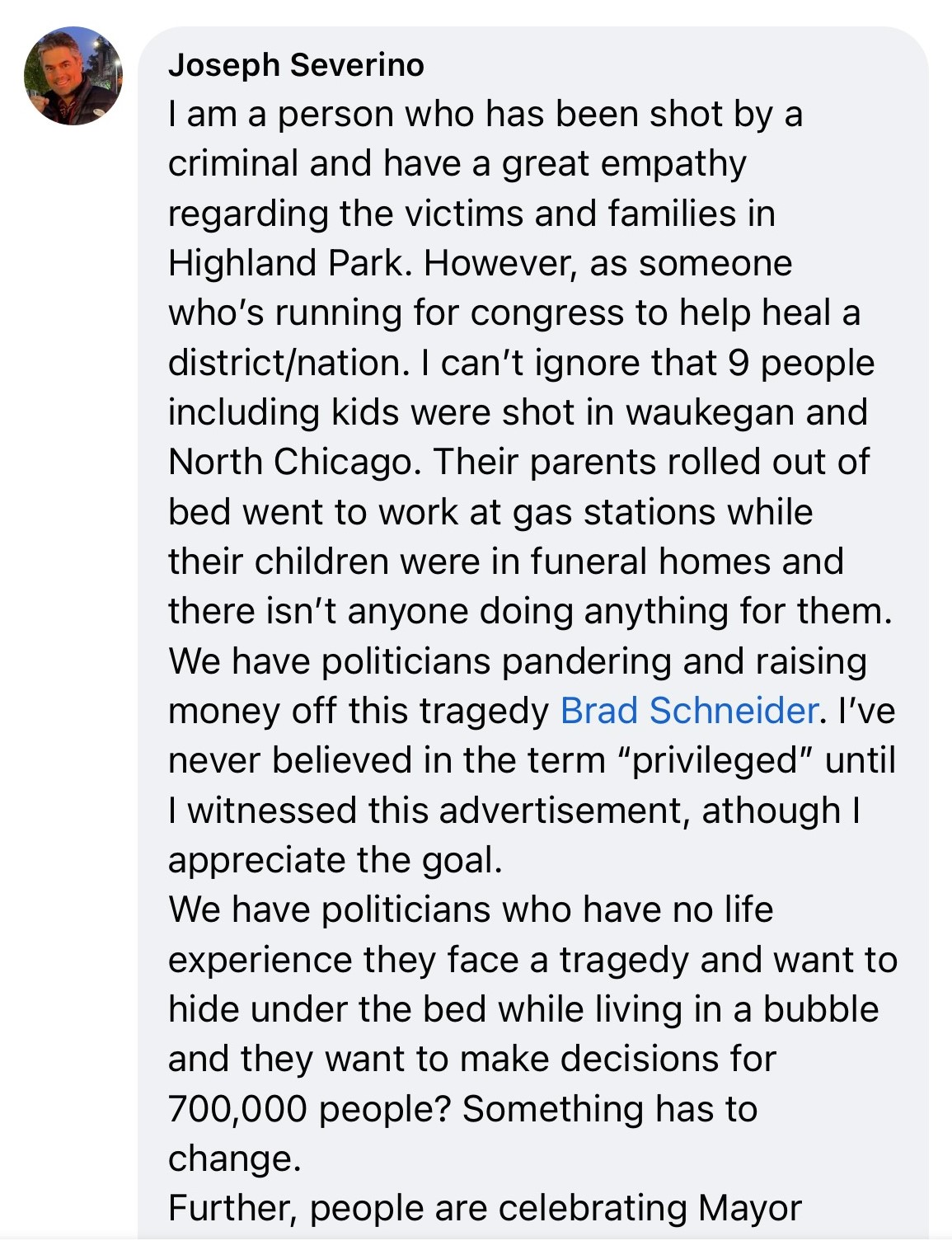 “Joe Severino’s misinformation around the Highland Park shooting is disgusting and has no place in our politics,” said Schneider’s campaign manager Matt Fried. “If he had a shred of decency, he would apologize to Mayor Rotering and the families of the victims whose memories he has sullied by lying about the tragedy and making common cause with conspiracy theorists.”