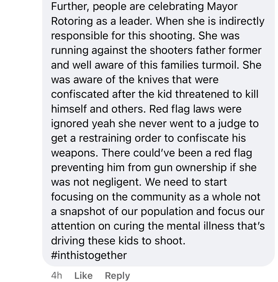 “Further, people are celebrating Mayor Rotering as a leader when she is indirectly responsible for the shooting,” Severino falsely claimed. “She was running against the shooters father and well aware of this family’s turmoil.”