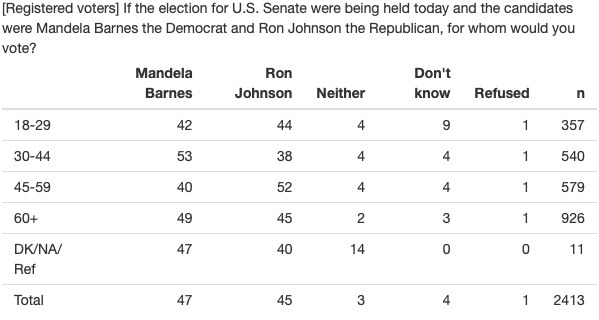 But in averaging the last three polls (including the one where Barnes had an overall lead), you can see that Johnson has a slight lead over Barnes with the 18-29 age group.