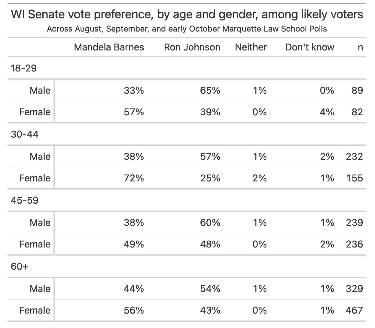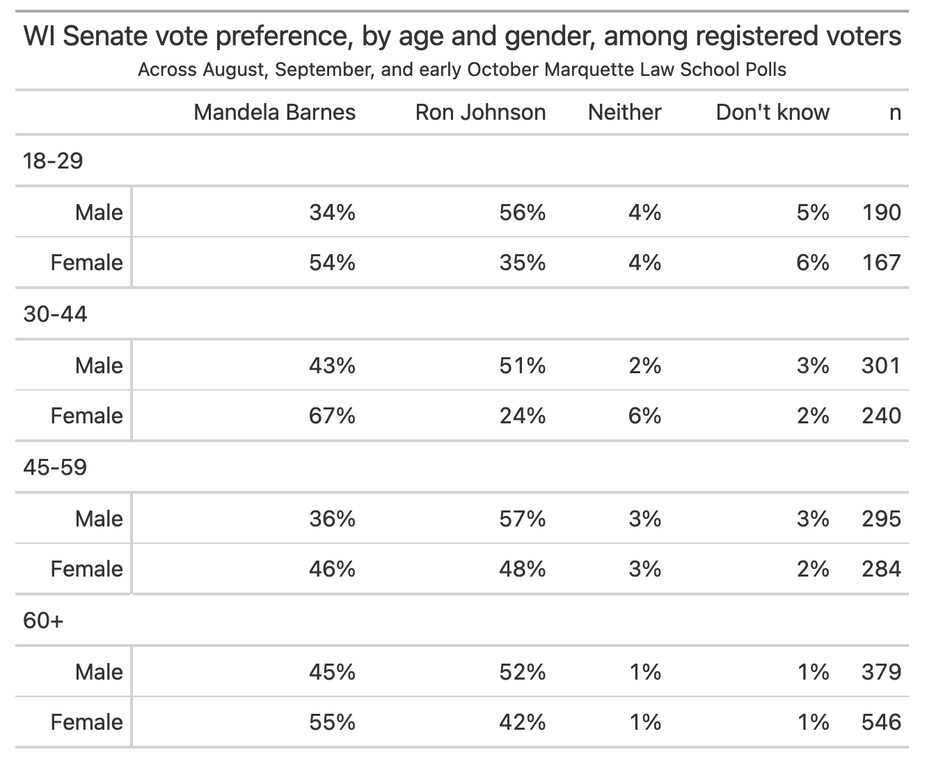 In August, Mandela Barnes — then riding high on a post-primary bounce — led Johnson 55%-40% with independent voters. That evened out to Barnes 48% to Johnson 49% in September, and now, Johnson leads 52% to 46% with independents.