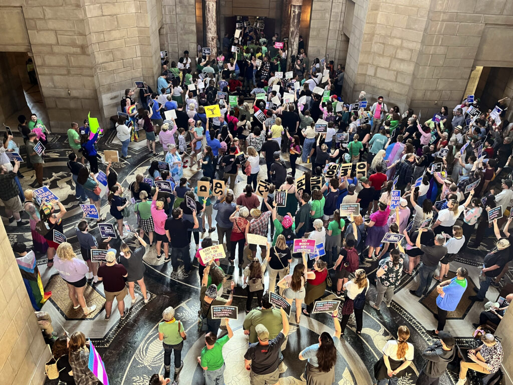 Outside the capitol in Omaha, a massive protest of concerned parents, advocates and queer activists attempted to pressure at least one Republican to flip their vote and kill the bill. Cries of “shut it down” and “one vote to save our lives” echoed through the marble halls of the capitol, but they fell on deaf ears.
