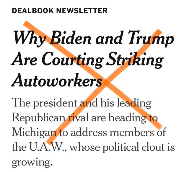 In numerous stories over several days, news outlets including The New York Times reported that Biden and Trump were basically doing the same thing but on different days. That’s just not true. Biden met with striking UAW workers on the picket line (a first for any U.S. president, by the way). The next day, Trump went to a non-union shop, invited by management.