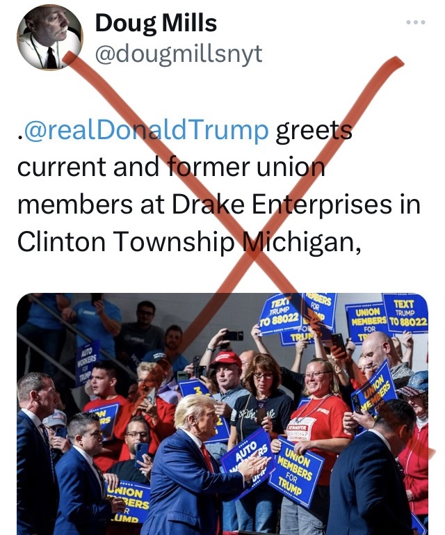 Then on X/Twitter, a top news photographer shared his picture of the Trump rally with an inaccurate caption that read: Trump “greets union members at Drake Enterprises in Clinton Township Michigan”. That post was corrected the next day, but not before Trump amplified it even more by reposting it on his Truth Social platform.