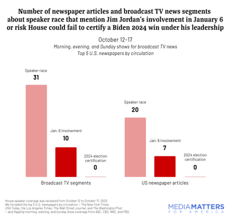 “After Rep. Jim Jordan (R-OH) became the leading contender in the House speaker’s race on the night of October 12, when Rep. Steve Scalise (R-LA) dropped out, top U.S. newspapers — The New York Times, the Los Angeles Times, The Washington Post, The Wall Street Journal, and USA Today — and broadcast TV coverage on ABC, CBS, NBC, and PBS often failed to inform audiences of Jordan’s role in trying to overturn the 2020 election.”