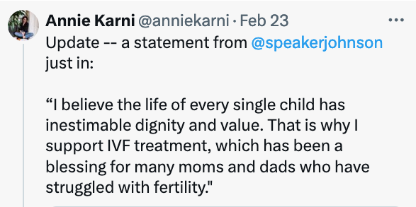 It took 12 hours for the Times to publish what they already knew: “Speaker Mike Johnson says he supports I.V.F. treatments, despite backing a bill that would threaten them.” You can see how that second line dramatically changes the story. But score a win for Johnson who, with an assist from The New York Times, muddied the water on what has become a politically fraught issue for his party.