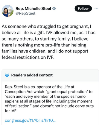 Republicans themselves also put a lot of bad information out there, including Congresswoman Nancy Mace and Michigan Senate candidate Mike Rogers. They claimed to support IVF, but fact checkers pointed out that while in Congress he’s supported four bills that have the same effect as the Alabama court ruling. Then there’s Rep. Michelle Steel (R-CA), who conceived her children through IVF but co-sponsored anti-IVF legislation. Steele’s hypocrisy did get called out by The New Republic and The Daily Kos with these headlines: “GOP Congresswoman Shows Mind-Blowing Hypocrisy on Alabama IVF Ruling” and “GOP congresswoman who used IVF wants to ban IVF,” respectively. Like Rogers, Steele also got fact-checked on social media.