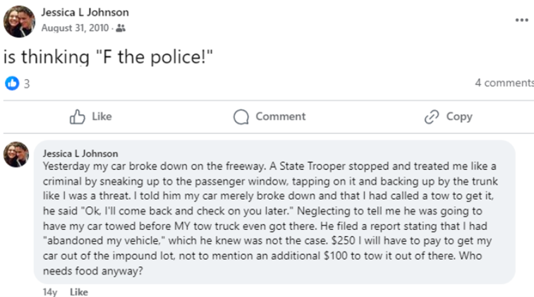 In 2010, Johnson made a since-deleted Facebook post explaining an altercation she had with a state trooper where she said, “F the police!”