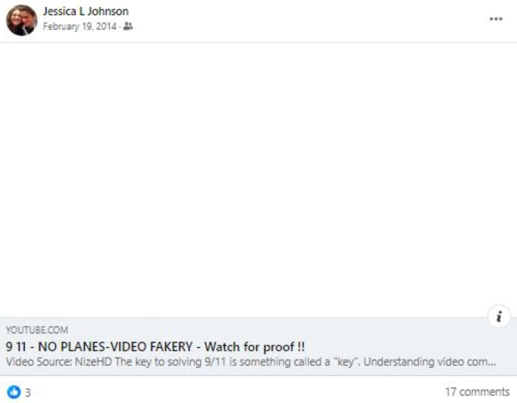 Johnson has also questioned the legitimacy of the 9/11 terrorist attacks when she posted a video in 2014 titled “9 11 – NO PLANES-VIDEO FAKERY – Watch for proof !!”
