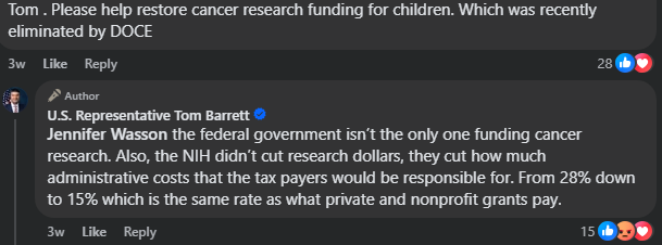 Barrett has pushed back on concerns about the NIH cuts threatening to disrupt vital research for things including cancer, women’s health, neurodegenerative diseases and mental health disorders at Michigan State University (MSU), which is located within his congressional district. Earlier this month, a concerned citizen on Facebook urged Barrett to help restore cancer funding research. Barrett parroted the Trump administration’s narrative and argued that the NIH cuts wouldn’t affect the research but would better utilize taxpayer dollars.