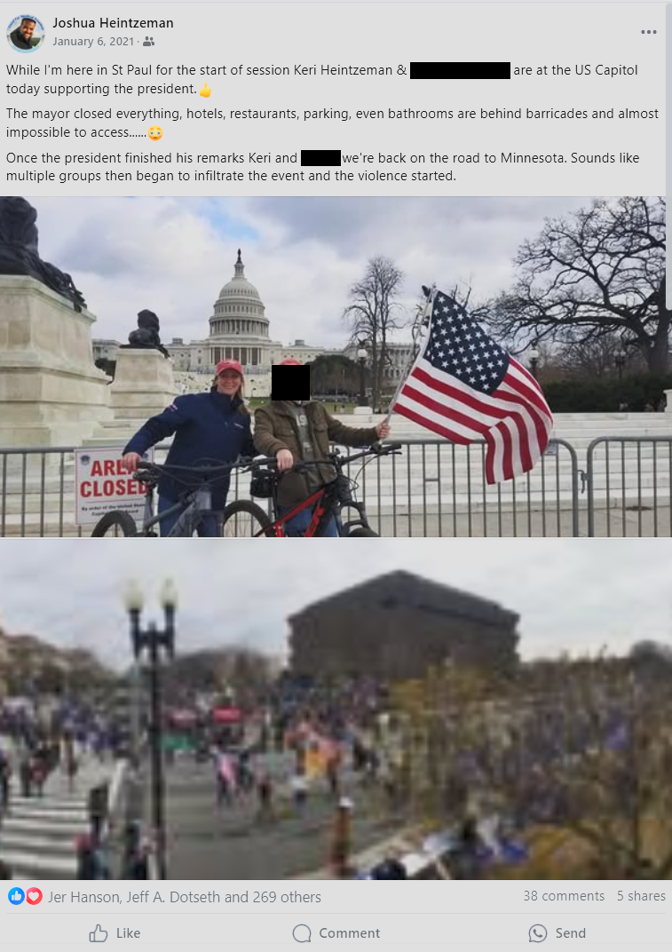 Photos from her husband state Rep. Josh Heintzeman’s (R-Nisswa) Facebook page shows Keri and her son in Washington D.C. on Jan. 6, with her husband claiming they left before the day’s events turned violent.