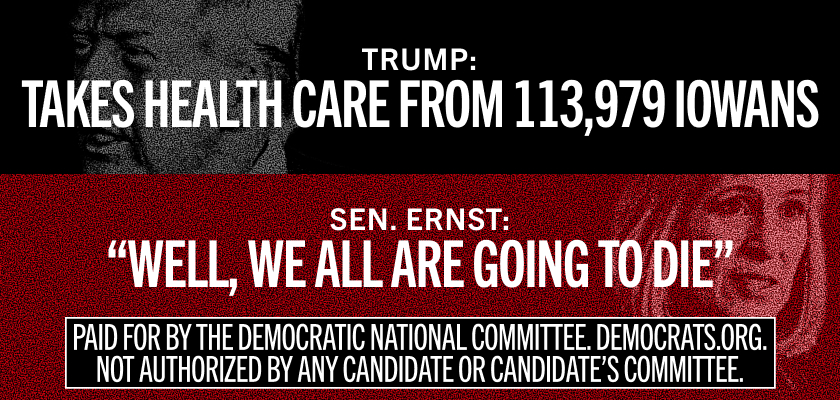 The DNC purchased multiple billboards in Des Moines, Iowa coinciding with the president’s visit to the city. With pictures of Trump and Ernst, the billboard reads, “TRUMP: TAKES HEALTH CARE FROM 113,979 IOWANS; SEN. ERNST: WELL, WE ALL ARE GOING TO DIE.”