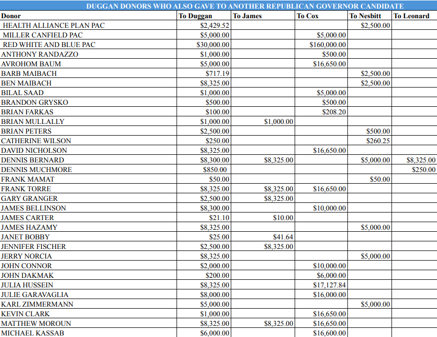 A Heartland Signal analysis of the financial disclosures found that over $200,000 of Duggan’s donations came from donors who also contributed to one or more of the Republican candidates in the race. Some of these donors include former Michigan Republican Party Chair Ronald Weiser, GOP megadonor JC Huizenga and former Michigan GOP co-chair Jeff Sakwa, who all gave Duggan the maximum $8,325 individual contribution.