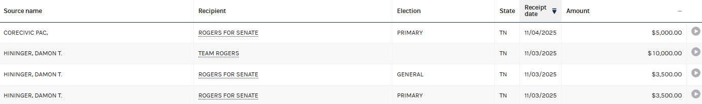 FEC reports also show a political action committee associated with GEO Group gave Rogers’ 2024 Senate campaign a combined $5,625. In addition to providing detention facilities, GEO Group’s transportation subsidiary is the largest provider of ground and air transportation for ICE operations.