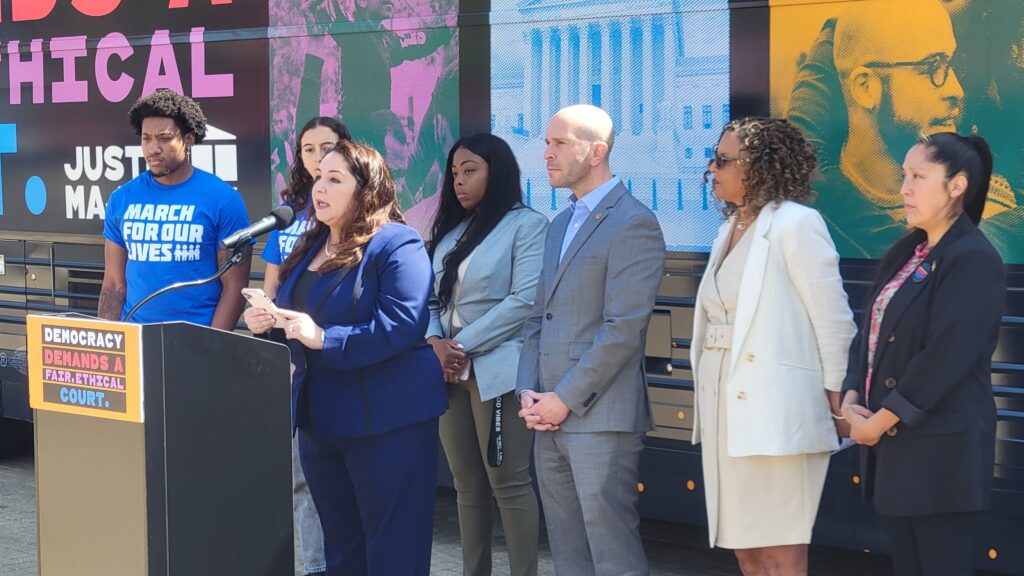 U.S. Rep. Delia Ramirez (D-IL) and Illinois state Rep. Bob Morgan (D-Deerfield) joined state gun reform advocates in Chicago Friday morning on the nationwide “Just Majority” bus tour to call for an overhaul of the U.S. Supreme Court.