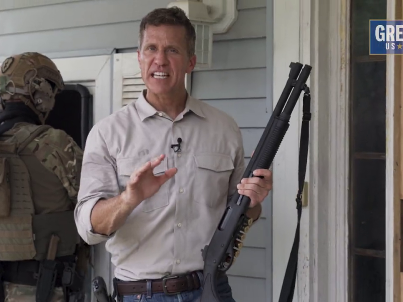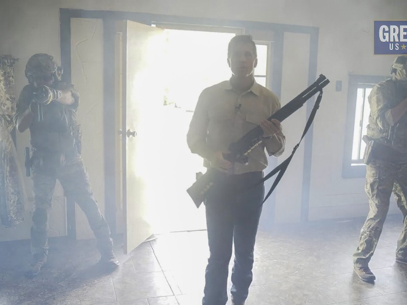 In the ad, Greitens and several supposed military members invade a house with a battering ram and assault rifles. It is implied that the home belongs to a political opponent, and Greitens himself says that they are “RINO hunting.”